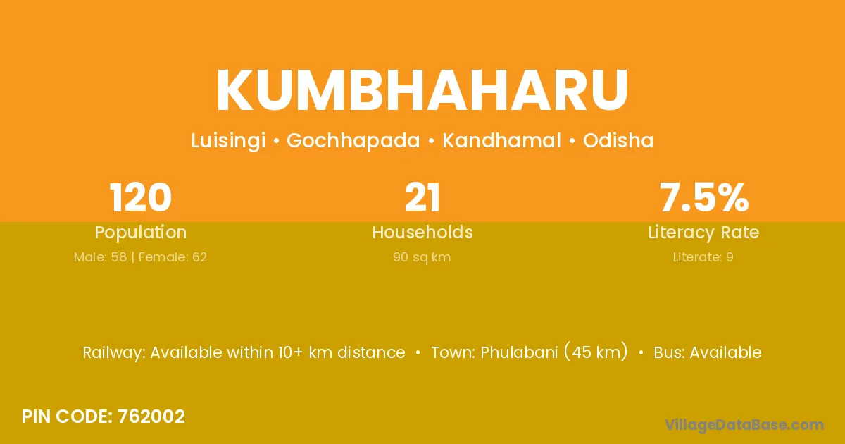 Phulabani (45 km) is the nearest town to Kumbhaharu village for major economic activities and is located approximately 45 km away.