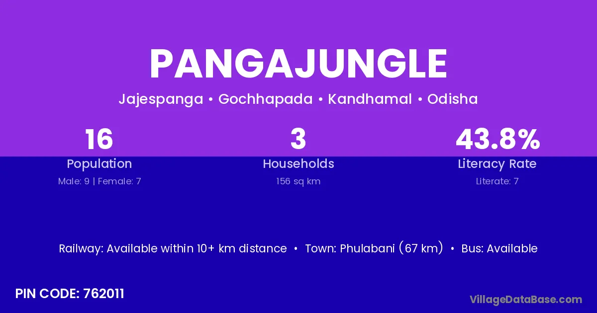 Phulabani (67 km) is the nearest town to Pangajungle village for major economic activities and is located approximately 67 km away.