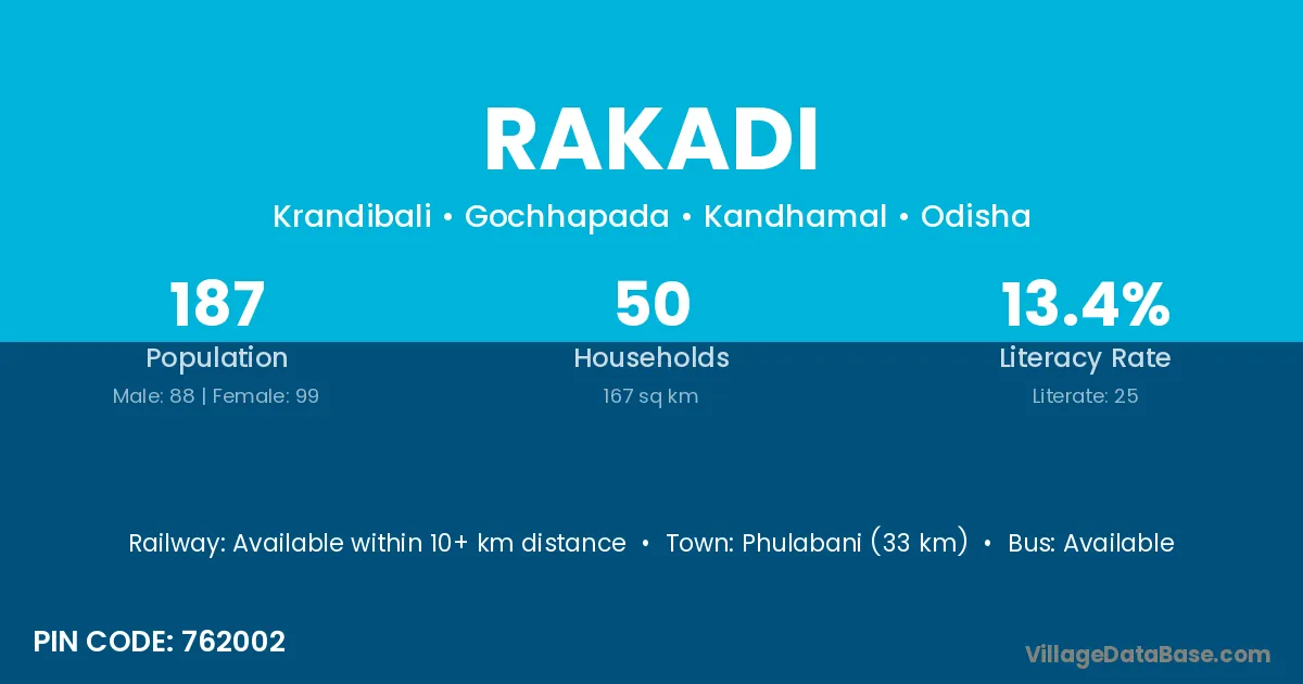 Phulabani (33 km) is the nearest town to Rakadi village for major economic activities and is located approximately 33 km away.