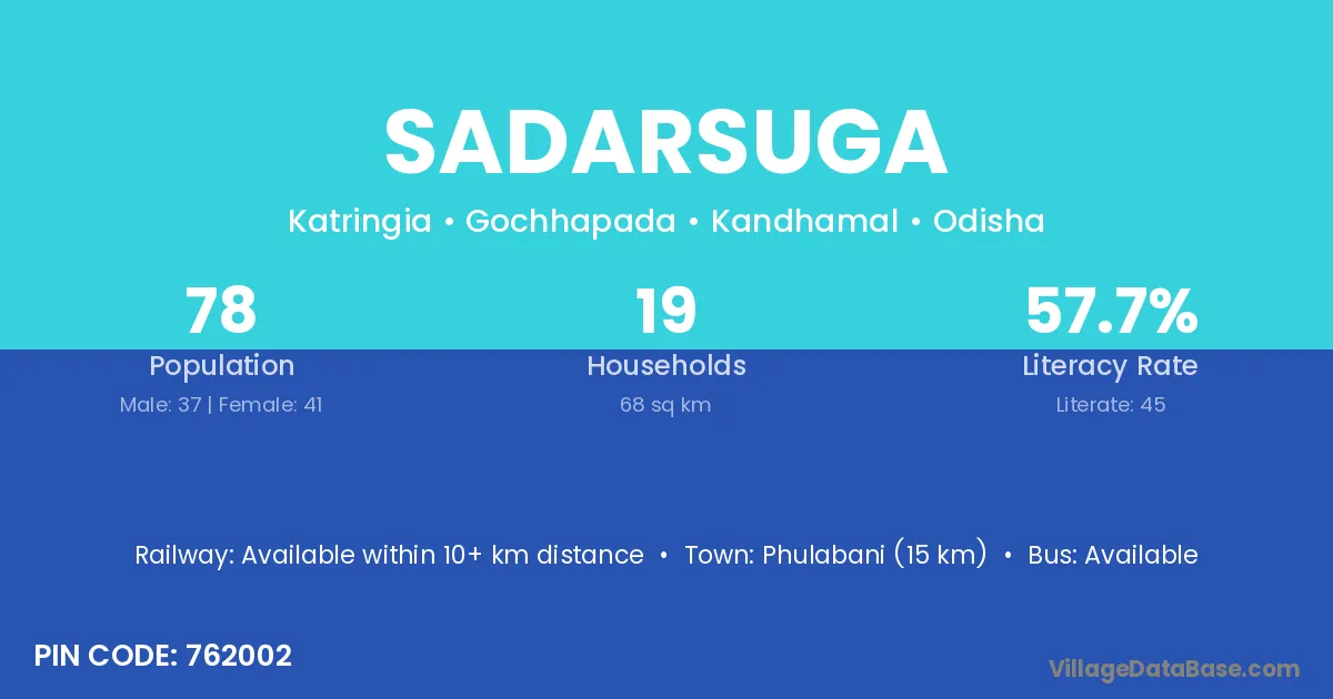 Phulabani (15 km) is the nearest town to Sadarsuga village for major economic activities and is located approximately 15 km away.