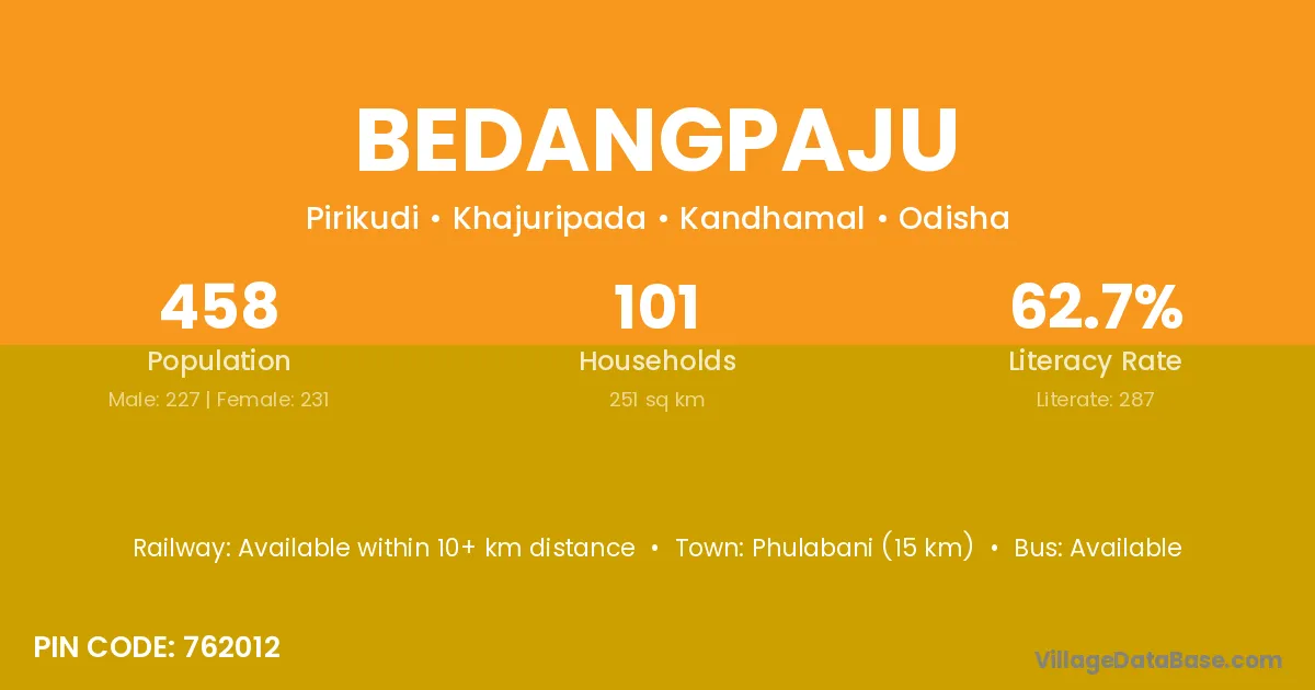 Phulabani (15 km) is the nearest town to Bedangpaju village for major economic activities and is located approximately 15 km away.