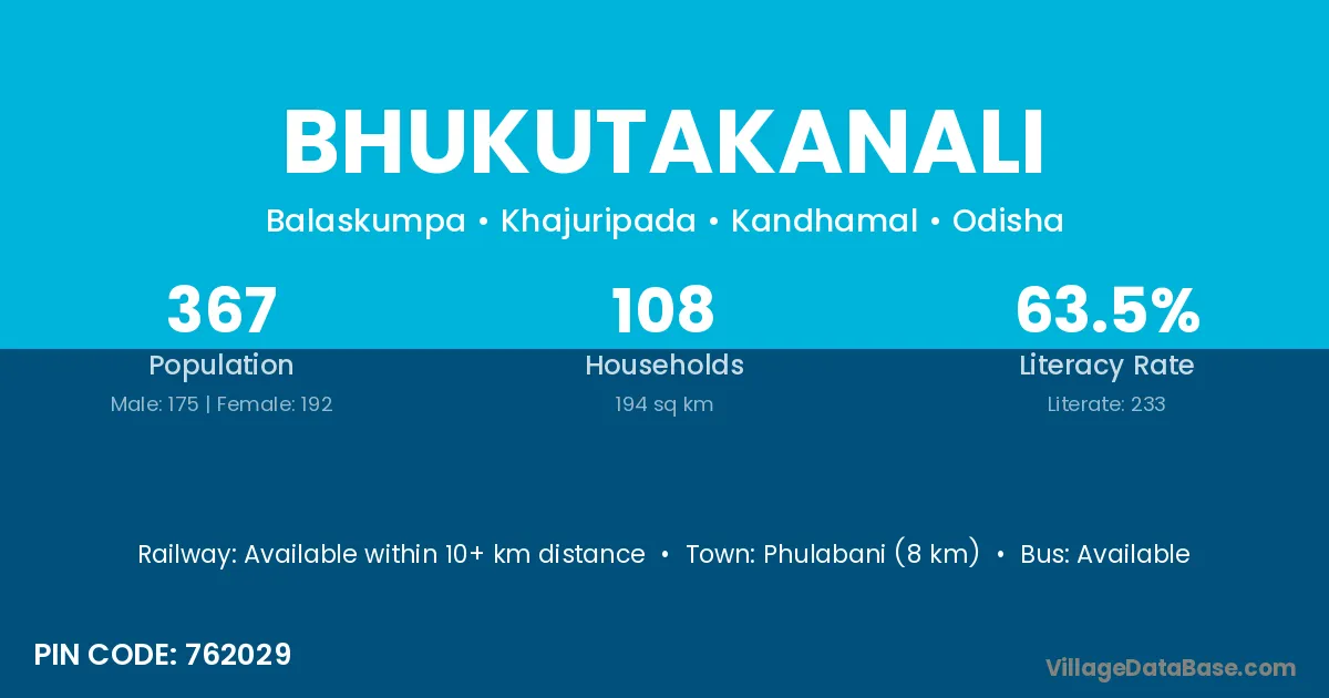 Phulabani (8 km) is the nearest town to Bhukutakanali village for major economic activities and is located approximately 8 km away.