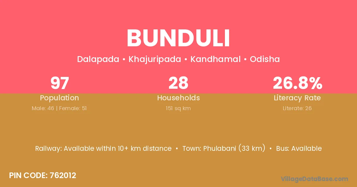 Phulabani (33 km) is the nearest town to Bunduli village for major economic activities and is located approximately 33 km away.