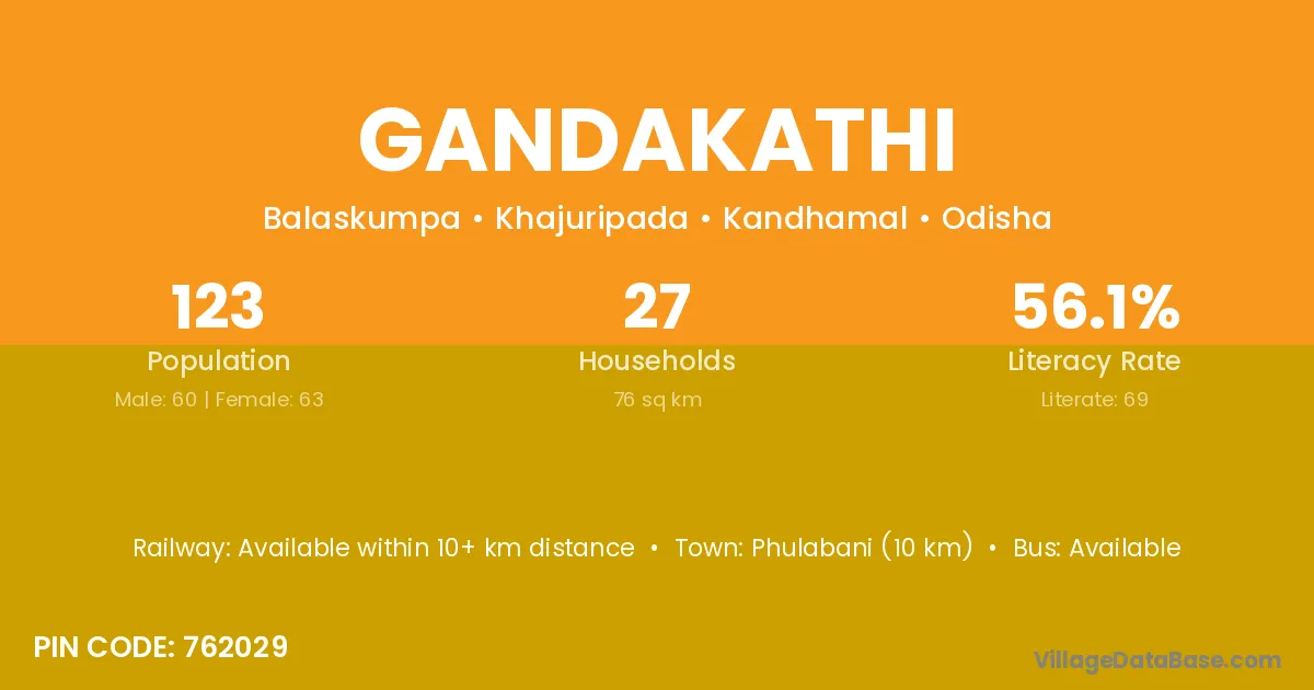 Phulabani (10 km) is the nearest town to Gandakathi village for major economic activities and is located approximately 10 km away.