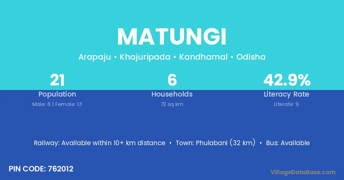 Phulabani (32 km) is the nearest town to Matungi village for major economic activities and is located approximately 32 km away.