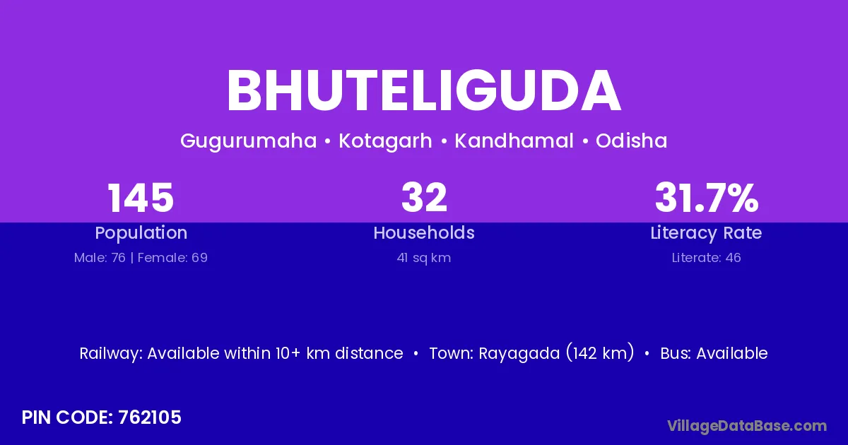 Bhuteliguda village has a total population of 145 people, of which 76 are males and 69 are females.