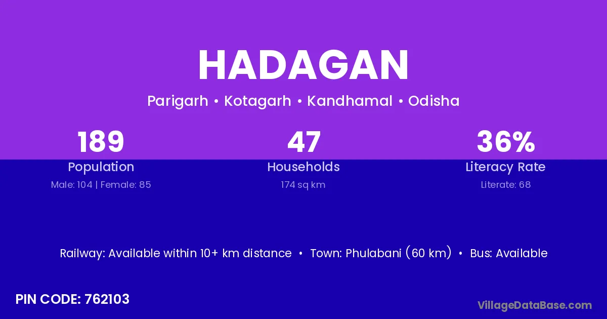 Phulabani (60 km) is the nearest town to Hadagan village for major economic activities and is located approximately 60 km away.