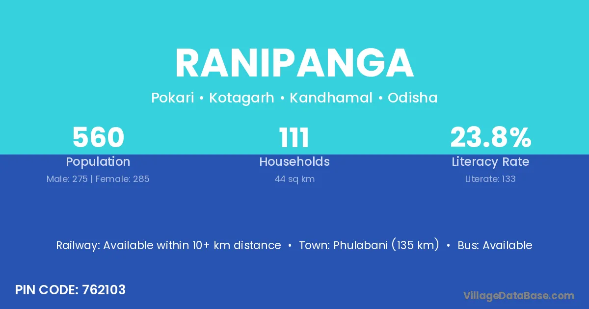 Ranipanga village has a total population of 560 people, of which 275 are males and 285 are females.
