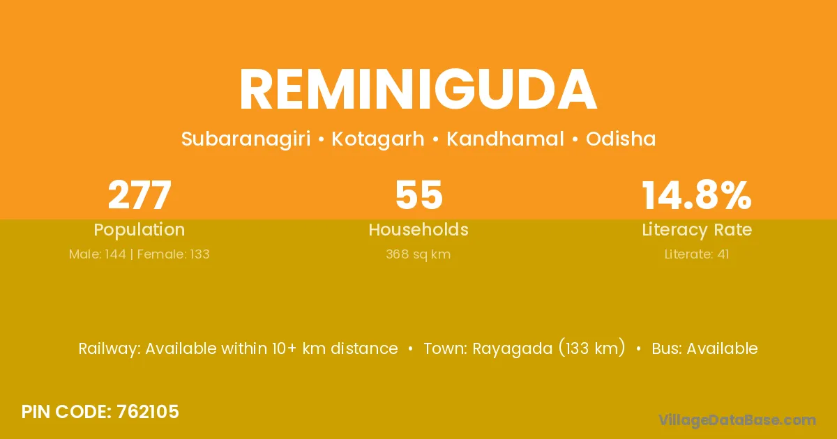 The literacy rate of Reminiguda village is 14.80%. Male literacy stands at 22.22% and female literacy at 6.77%.