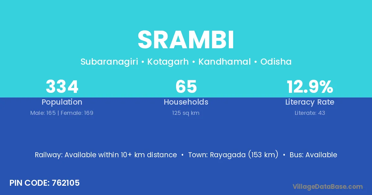 Rayagada (153 km) is the nearest town to Srambi village for major economic activities and is located approximately 153 km away.