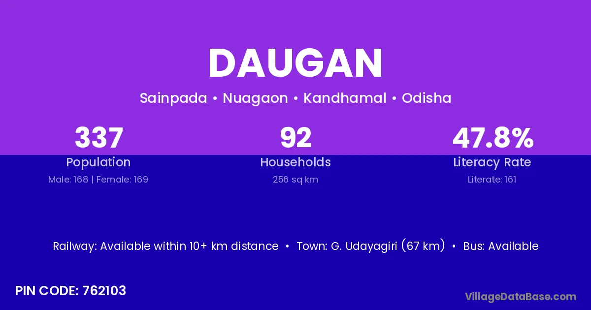G. Udayagiri (67 km) is the nearest town to Daugan village for major economic activities and is located approximately 67 km away.