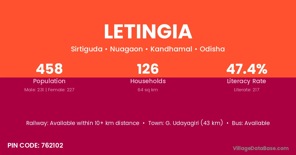 G. Udayagiri (43 km) is the nearest town to Letingia village for major economic activities and is located approximately 43 km away.
