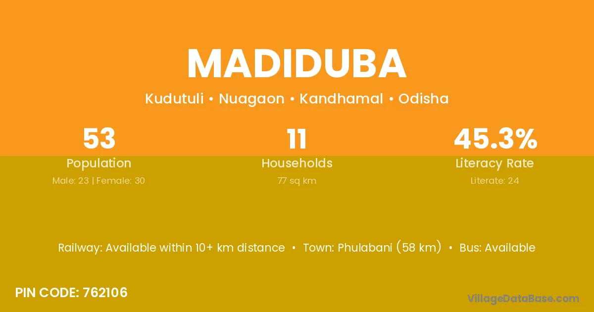 Phulabani (58 km) is the nearest town to Madiduba village for major economic activities and is located approximately 58 km away.