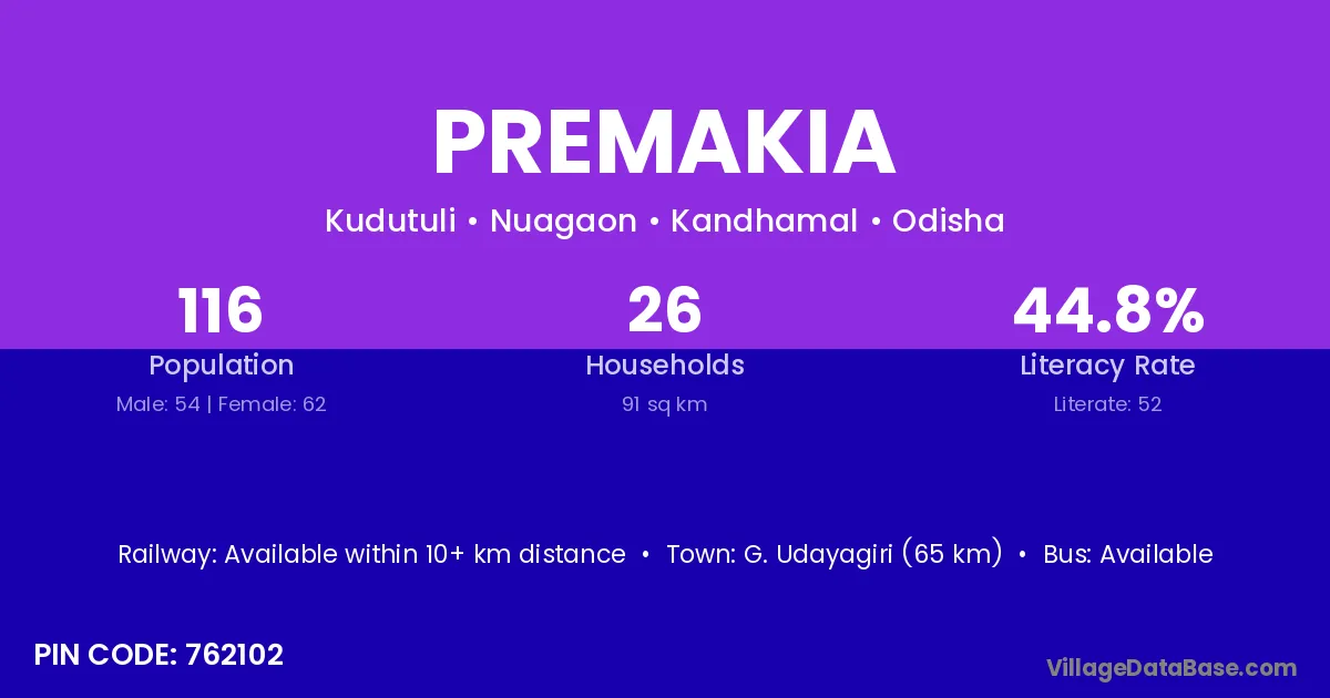 G. Udayagiri (65 km) is the nearest town to Premakia village for major economic activities and is located approximately 65 km away.