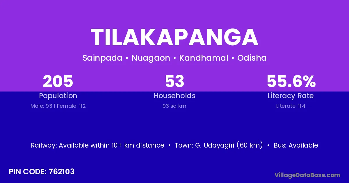 G. Udayagiri (60 km) is the nearest town to Tilakapanga village for major economic activities and is located approximately 60 km away.