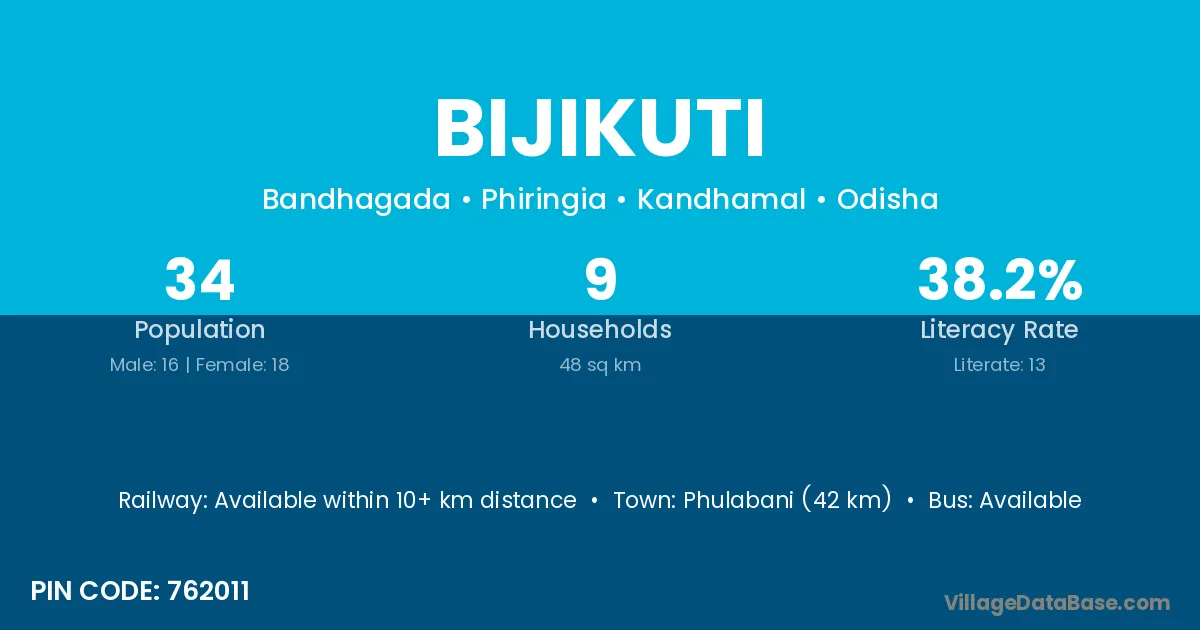 Phulabani (42 km) is the nearest town to Bijikuti village for major economic activities and is located approximately 42 km away.