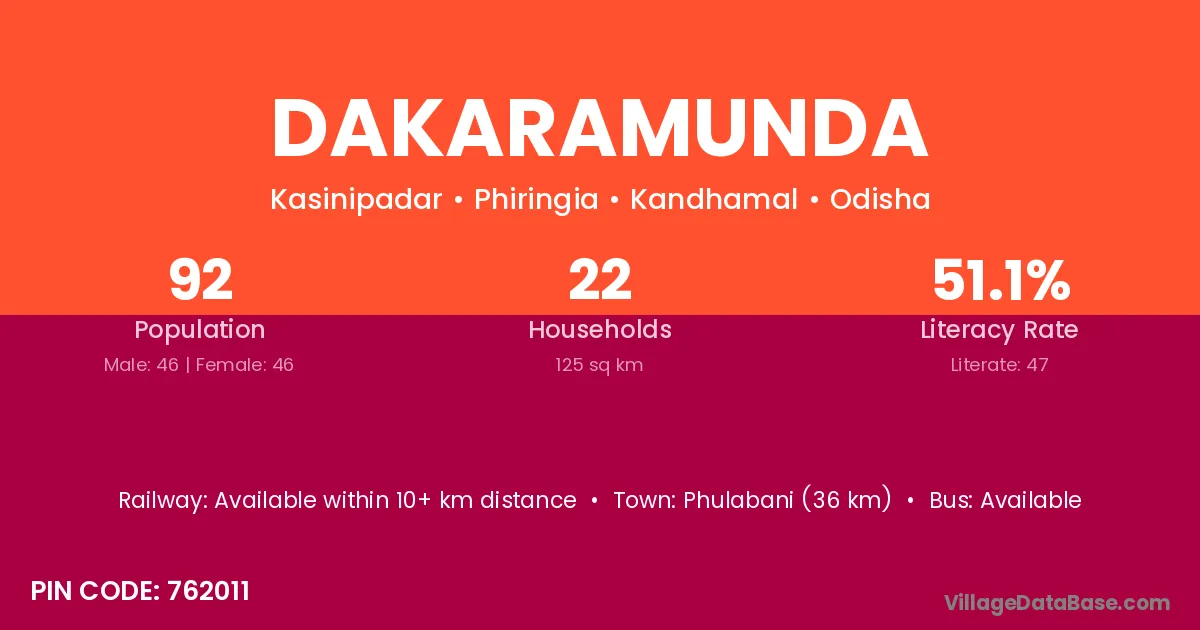 Phulabani (36 km) is the nearest town to Dakaramunda village for major economic activities and is located approximately 36 km away.
