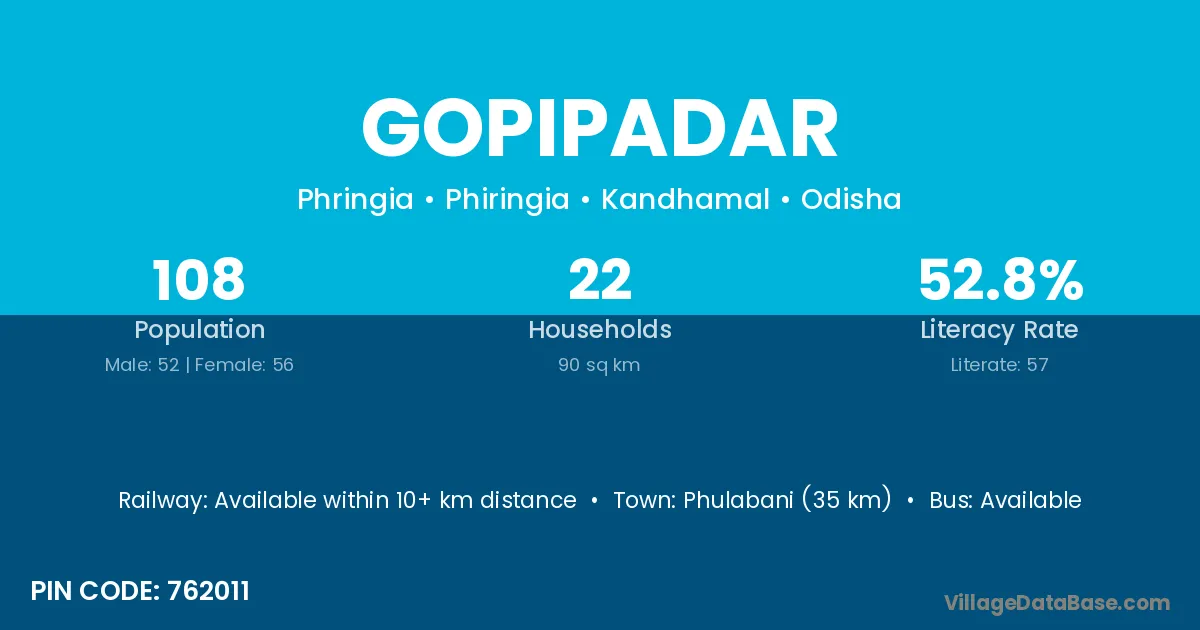 Phulabani (35 km) is the nearest town to Gopipadar village for major economic activities and is located approximately 35 km away.