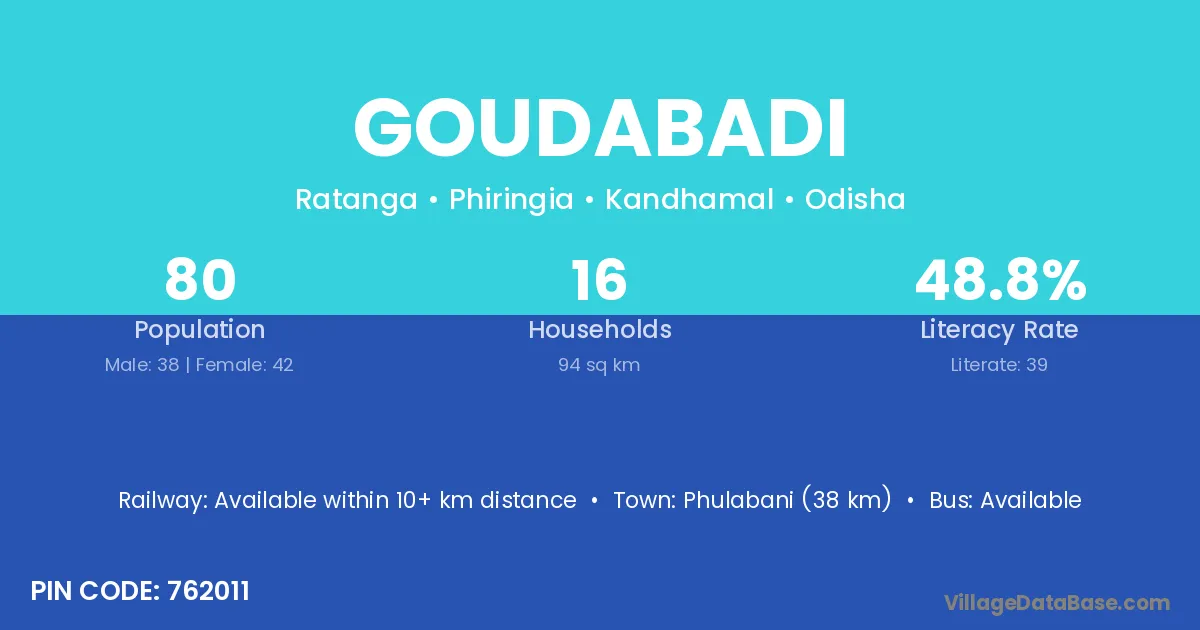 Phulabani (38 km) is the nearest town to Goudabadi village for major economic activities and is located approximately 38 km away.