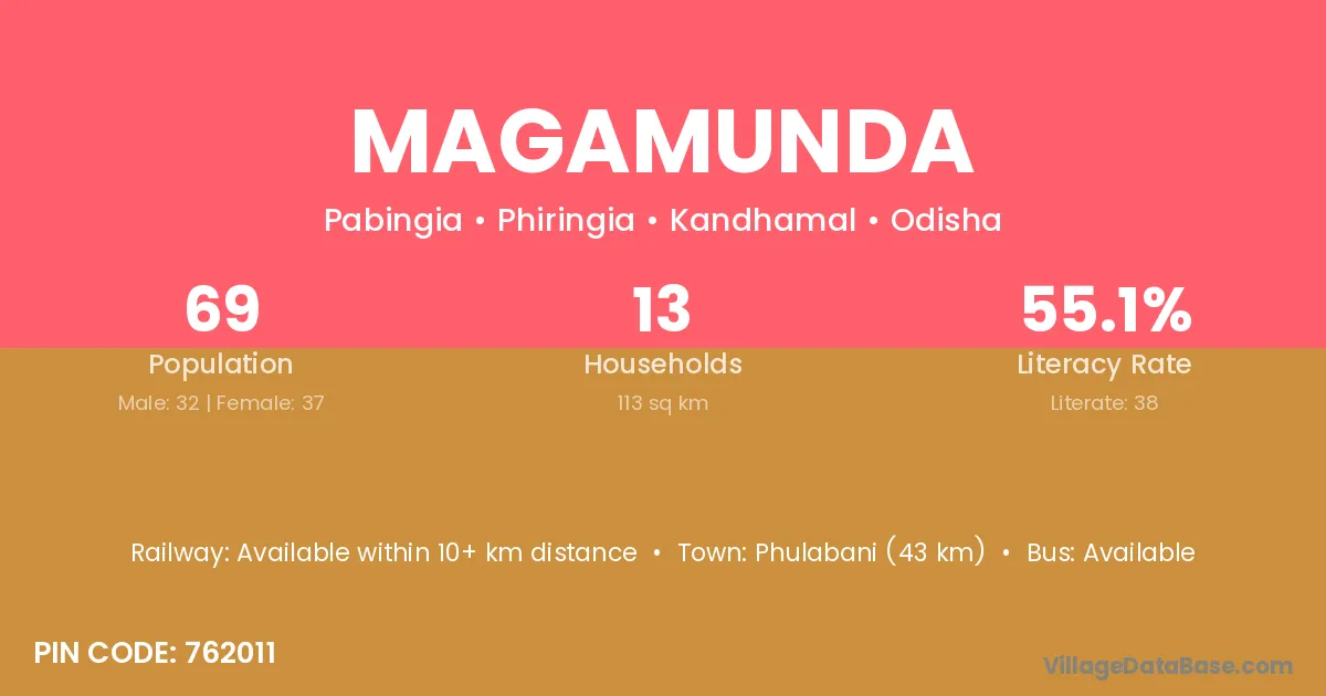 Phulabani (43 km) is the nearest town to Magamunda village for major economic activities and is located approximately 43 km away.