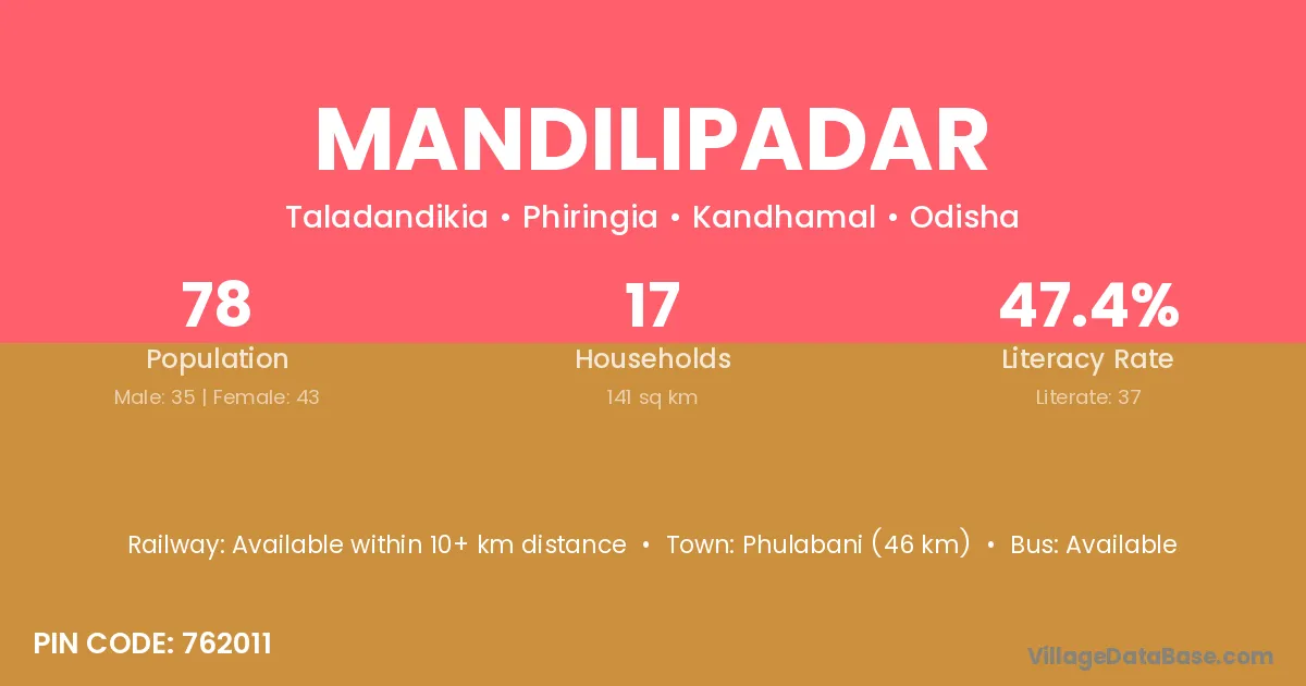 Phulabani (46 km) is the nearest town to Mandilipadar village for major economic activities and is located approximately 46 km away.