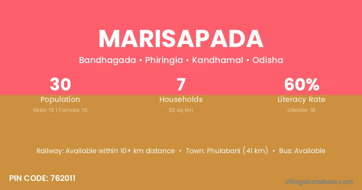 Phulabani (41 km) is the nearest town to Marisapada village for major economic activities and is located approximately 41 km away.