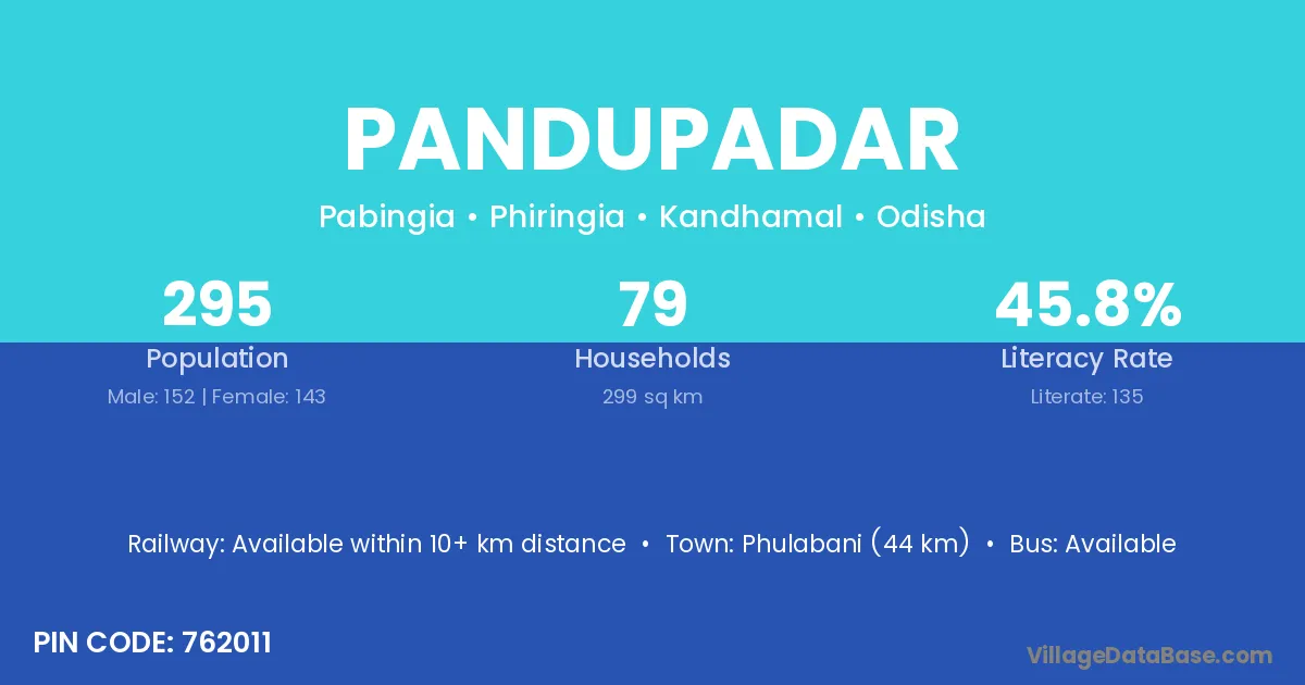 Phulabani (44 km) is the nearest town to Pandupadar village for major economic activities and is located approximately 44 km away.