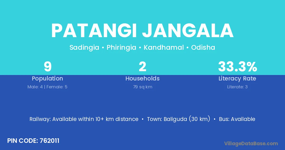 Baliguda (30 km) is the nearest town to Patangi Jangala village for major economic activities and is located approximately 30 km away.