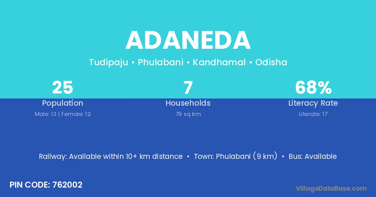Phulabani (9 km) is the nearest town to Adaneda village for major economic activities and is located approximately 9 km away.