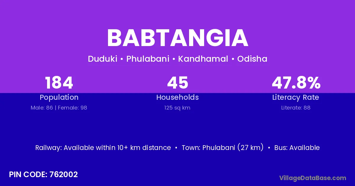 Phulabani (27 km) is the nearest town to Babtangia village for major economic activities and is located approximately 27 km away.