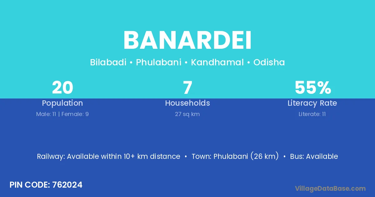 Phulabani (26 km) is the nearest town to Banardei village for major economic activities and is located approximately 26 km away.