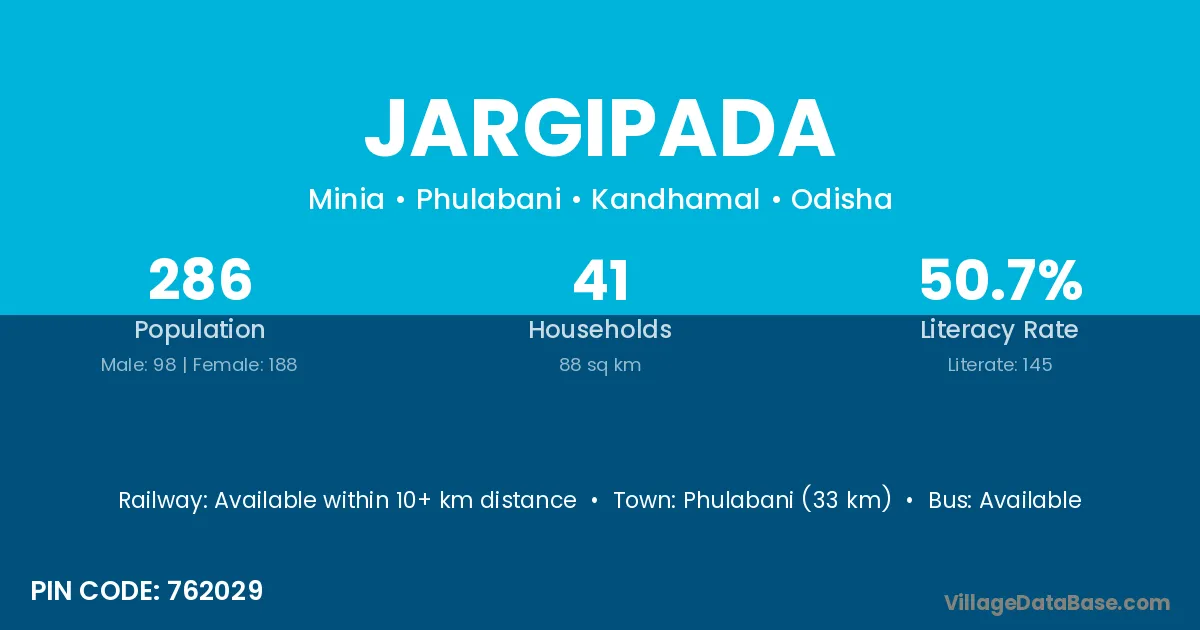 Phulabani (33 km) is the nearest town to Jargipada village for major economic activities and is located approximately 33 km away.