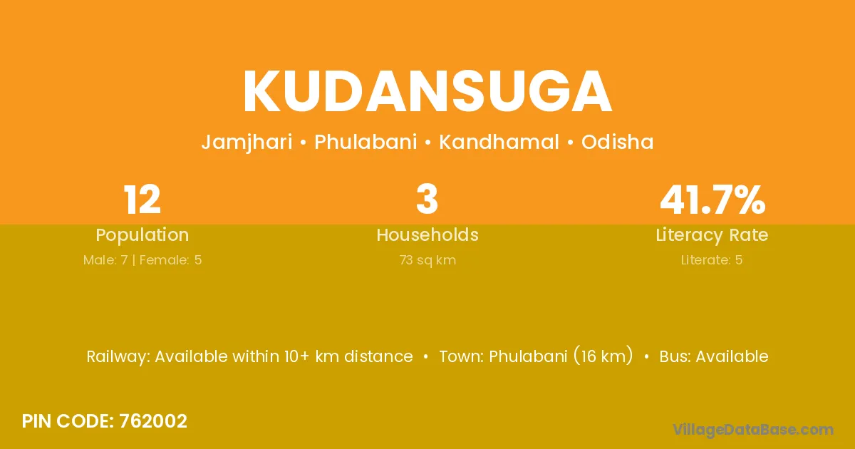 Phulabani (16 km) is the nearest town to Kudansuga village for major economic activities and is located approximately 16 km away.