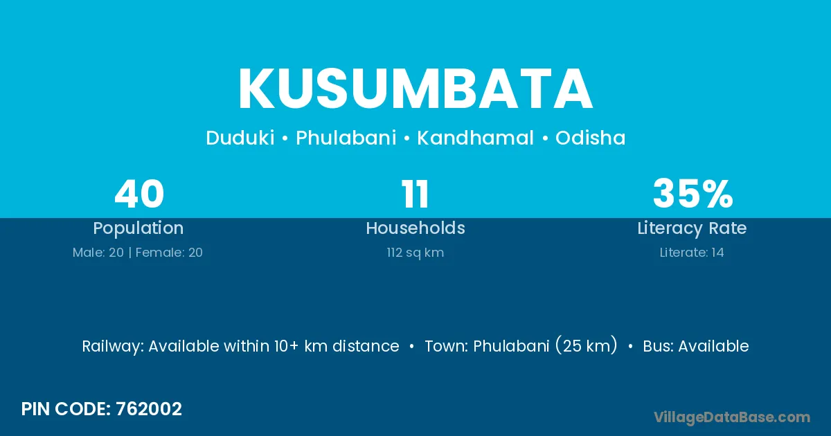 Phulabani (25 km) is the nearest town to Kusumbata village for major economic activities and is located approximately 25 km away.