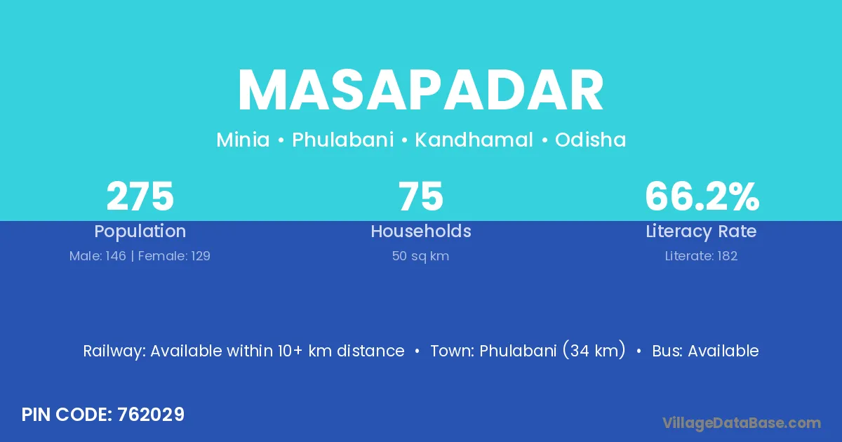 Phulabani (34 km) is the nearest town to Masapadar village for major economic activities and is located approximately 34 km away.