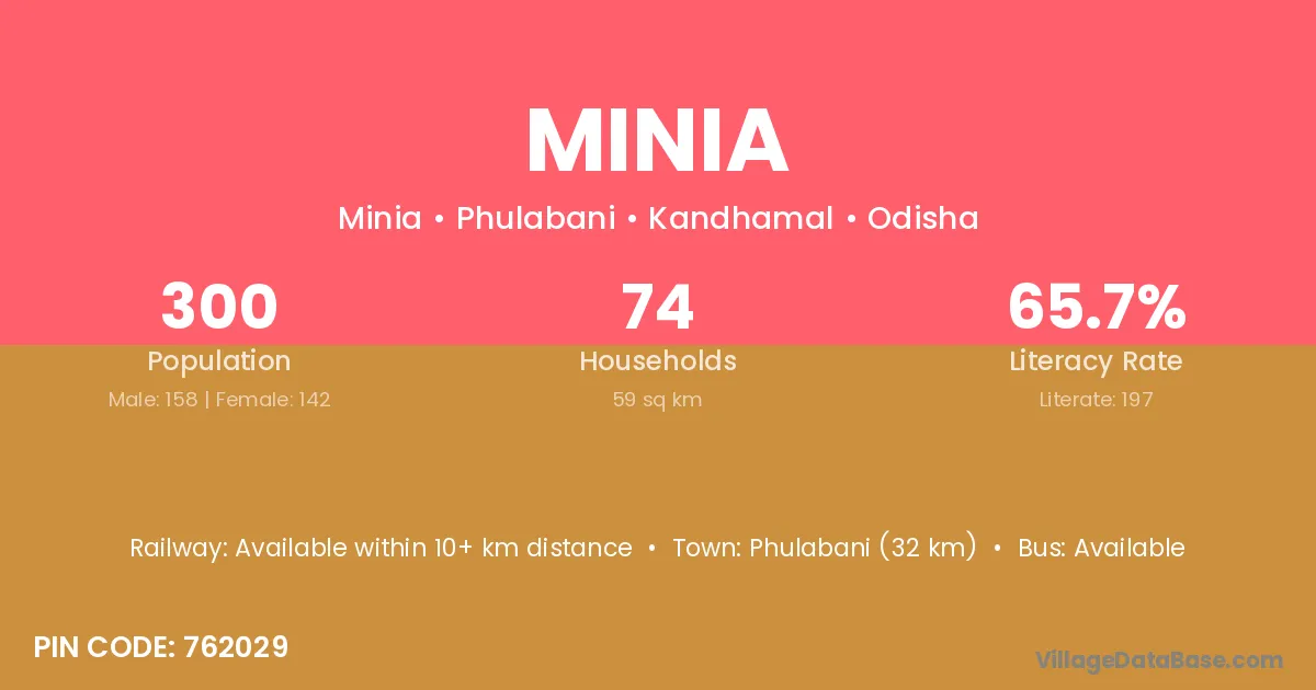 Phulabani (32 km) is the nearest town to Minia village for major economic activities and is located approximately 32 km away.