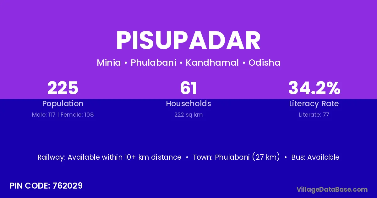 Phulabani (27 km) is the nearest town to Pisupadar village for major economic activities and is located approximately 27 km away.