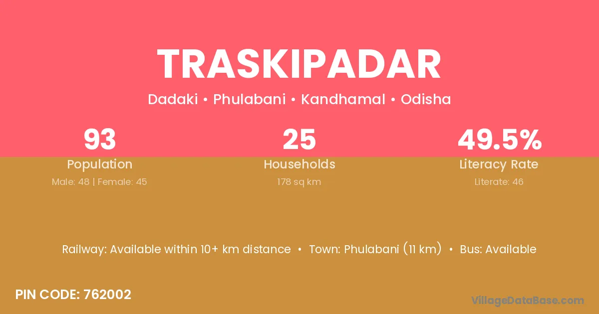 Phulabani (11 km) is the nearest town to Traskipadar village for major economic activities and is located approximately 11 km away.