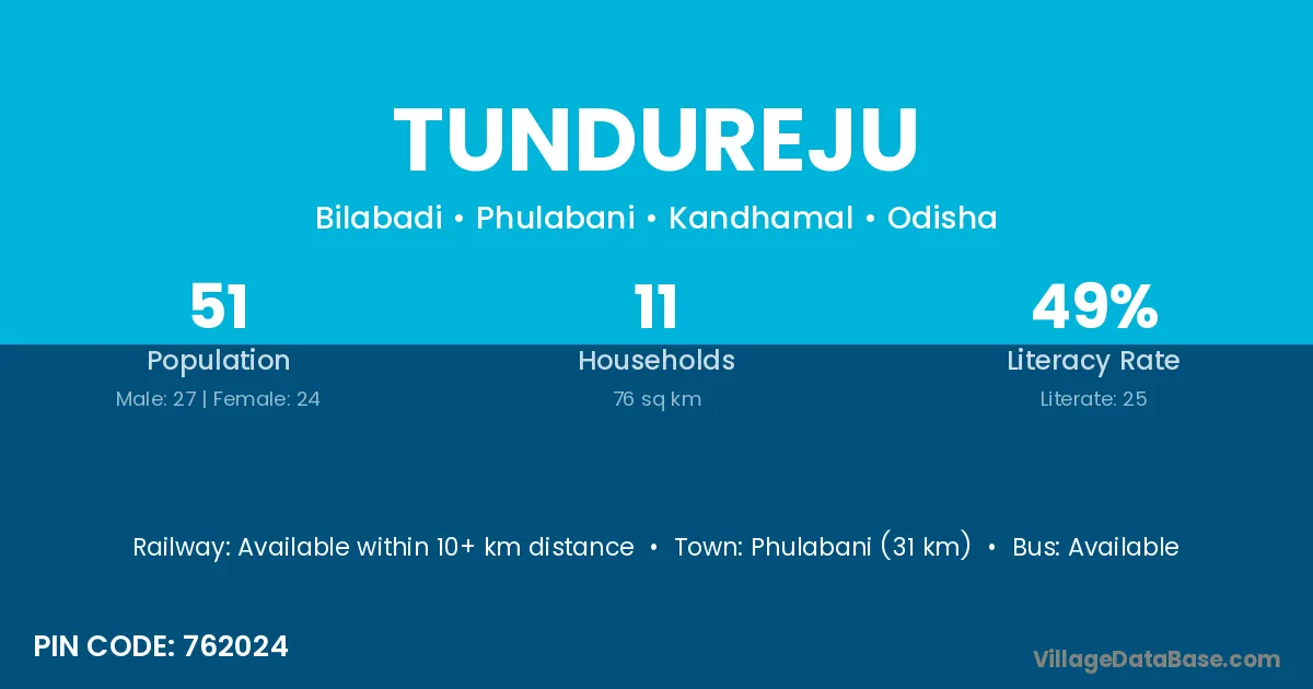 Phulabani (31 km) is the nearest town to Tundureju village for major economic activities and is located approximately 31 km away.