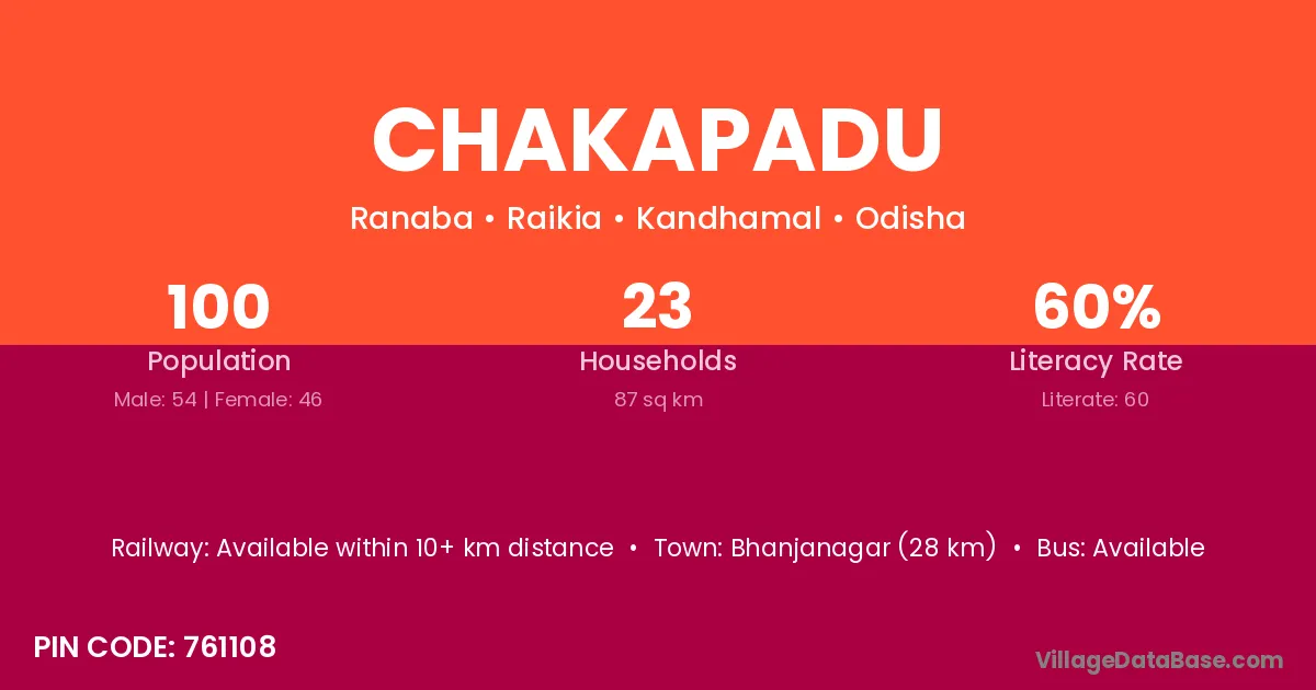 Bhanjanagar (28 km) is the nearest town to Chakapadu village for major economic activities and is located approximately 28 km away.
