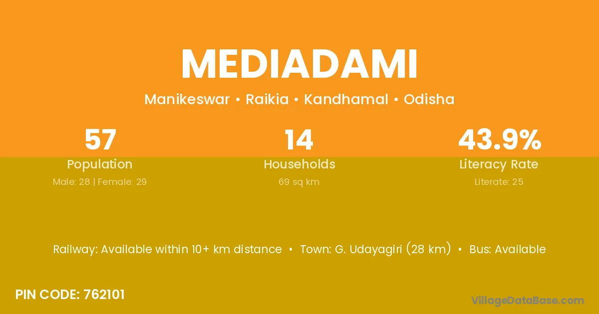 Mediadami village has a total population of 57 people, of which 28 are males and 29 are females.