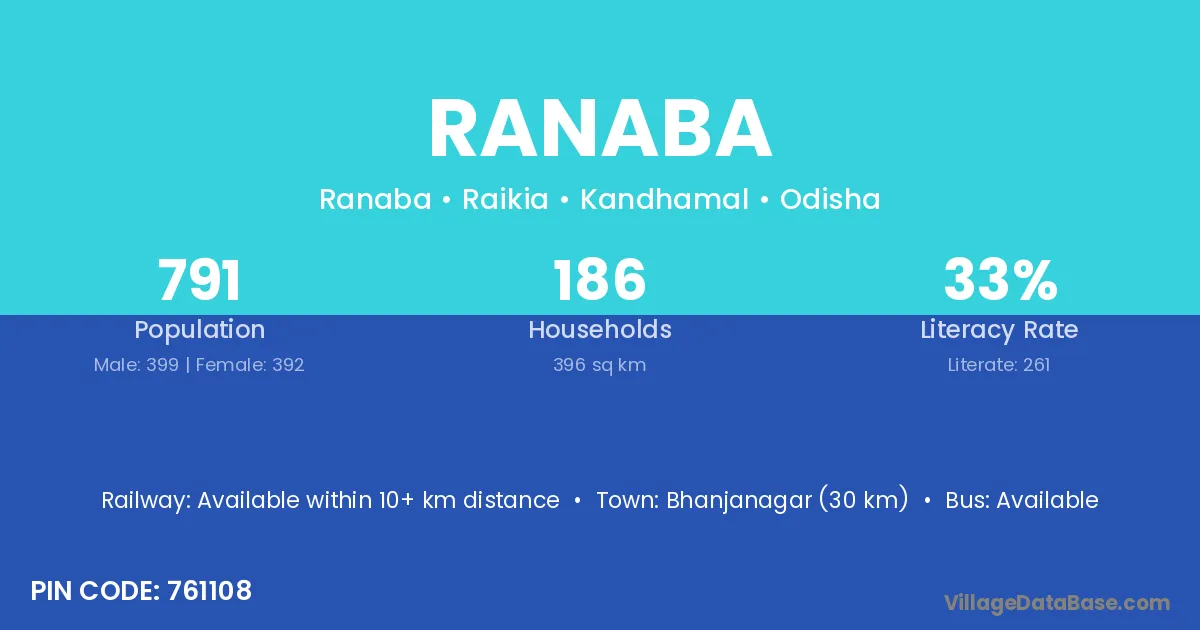 Ranaba village has a total population of 791 people, of which 399 are males and 392 are females.