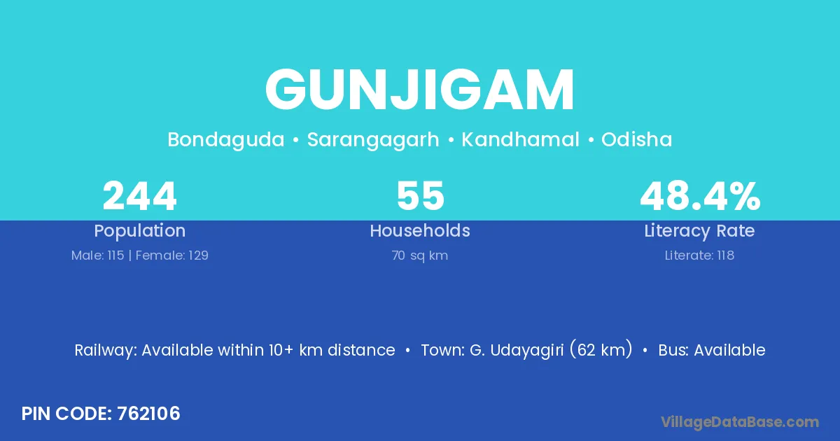 G. Udayagiri (62 km) is the nearest town to Gunjigam village for major economic activities and is located approximately 62 km away.