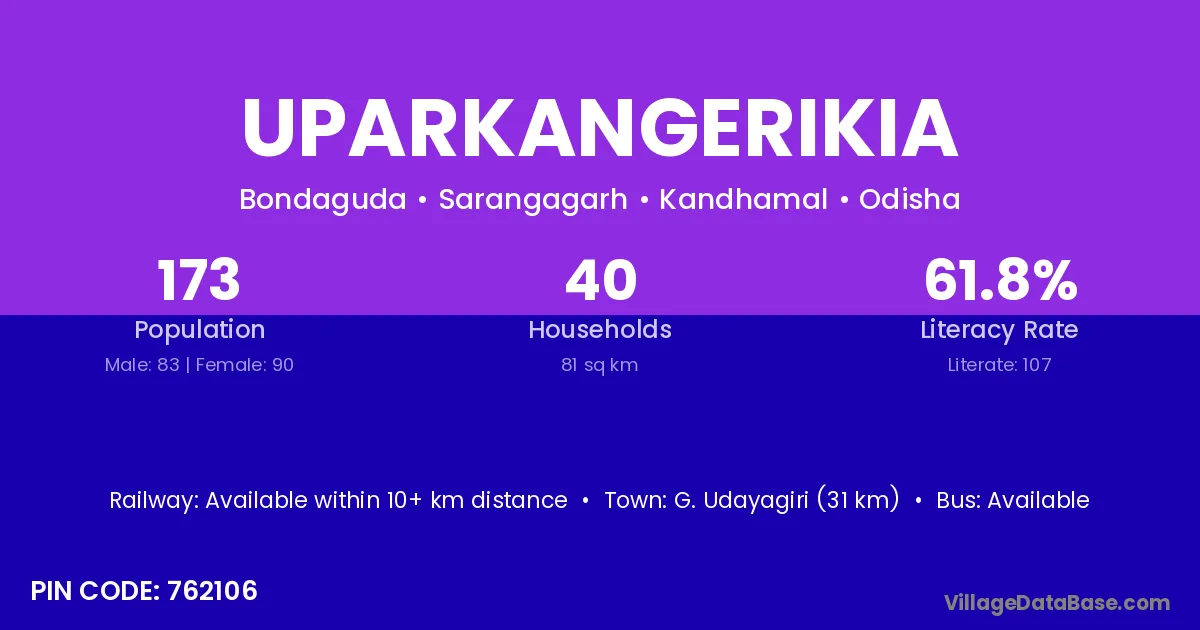 Uparkangerikia village has a total population of 173 people, of which 83 are males and 90 are females.