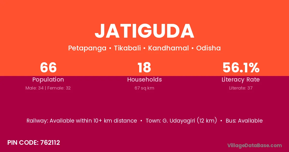 Jatiguda village has a total population of 66 people, of which 34 are males and 32 are females.