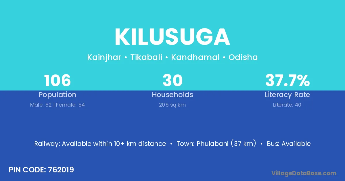 Phulabani (37 km) is the nearest town to Kilusuga village for major economic activities and is located approximately 37 km away.