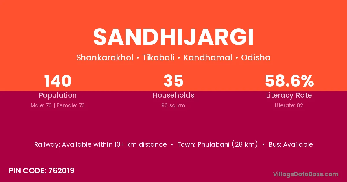 Phulabani (28 km) is the nearest town to Sandhijargi village for major economic activities and is located approximately 28 km away.