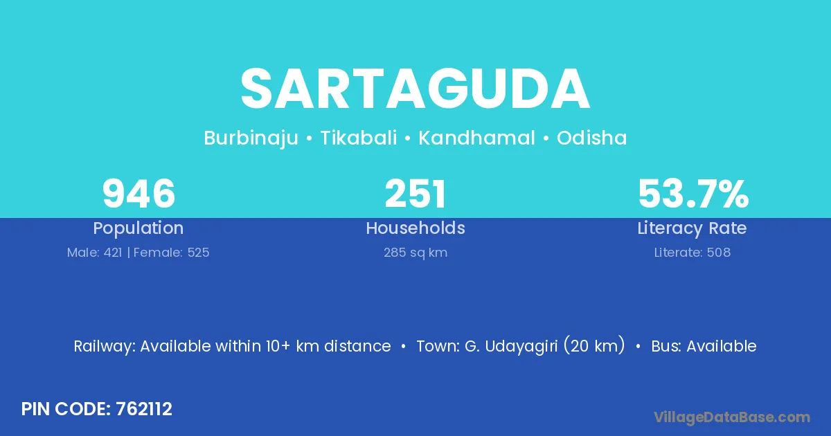 G. Udayagiri (20 km) is the nearest town to Sartaguda village for major economic activities and is located approximately 20 km away.