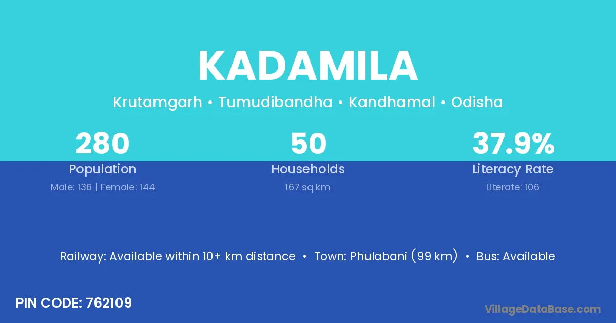 Phulabani (99 km) is the nearest town to Kadamila village for major economic activities and is located approximately 99 km away.