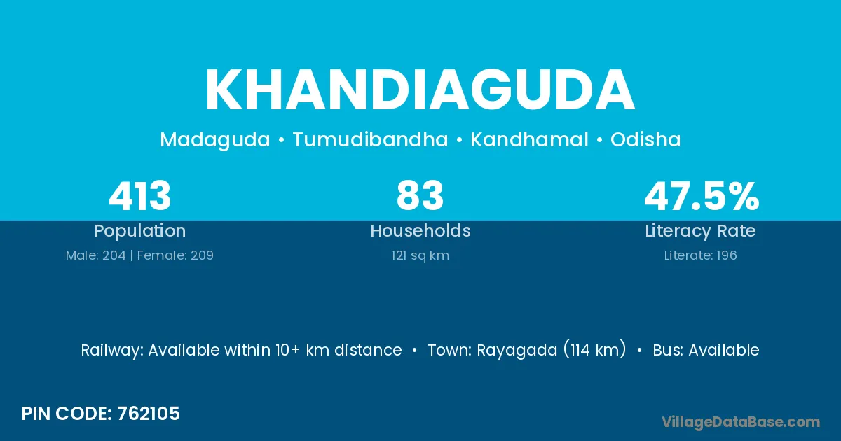 Rayagada (114 km) is the nearest town to Khandiaguda village for major economic activities and is located approximately 114 km away.